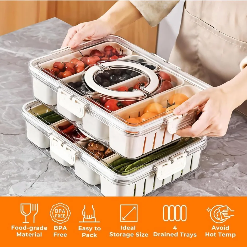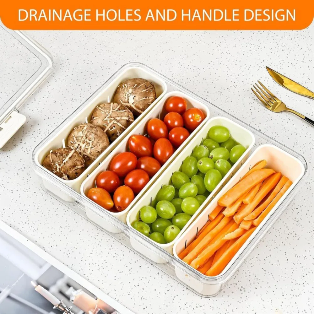 - ✅ DRAINAGE HOLES AND HANDLE DESIGN: Equipped with drainage holes at the bottom of the four inner trays, these containers make cleaning fruits & vegetables effortlessly by straining excess water, ensuring pristine cleanliness and preventing spoilage.